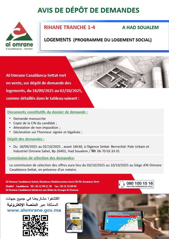 Al Omrane Casablanca-Settat met en vente, sur dépôt de demande des logements dans le cadre du programme du logement social, du 18/09/2025 au 02/10/2025, à Had soualem.
