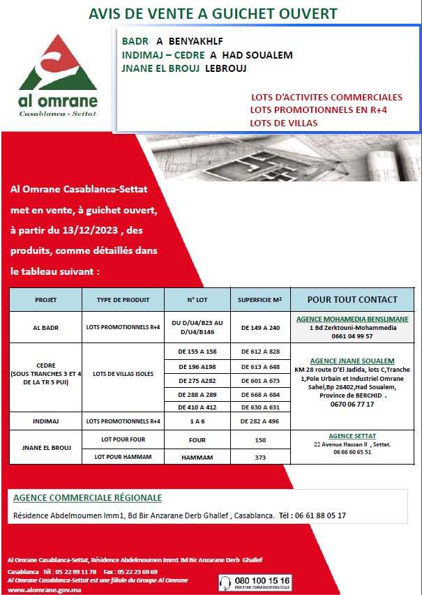 VENTE A GUICHET OUVERT - LOTS D'ACTIVITES ET LOTS DE TERRAIN SIS AUX PROJETS : BADR - BROUJ - CEDRE - INDIMAJ
